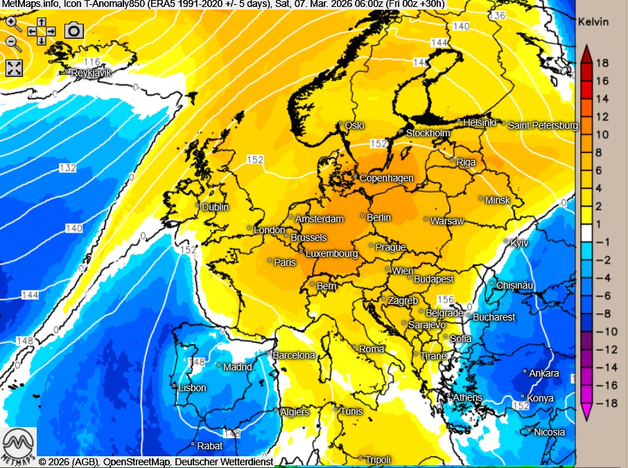 Die Wetter- und Temperaturkarte sowie die 850-hPa-Temperaturanomalie (06:00 Uhr) nach ICON: