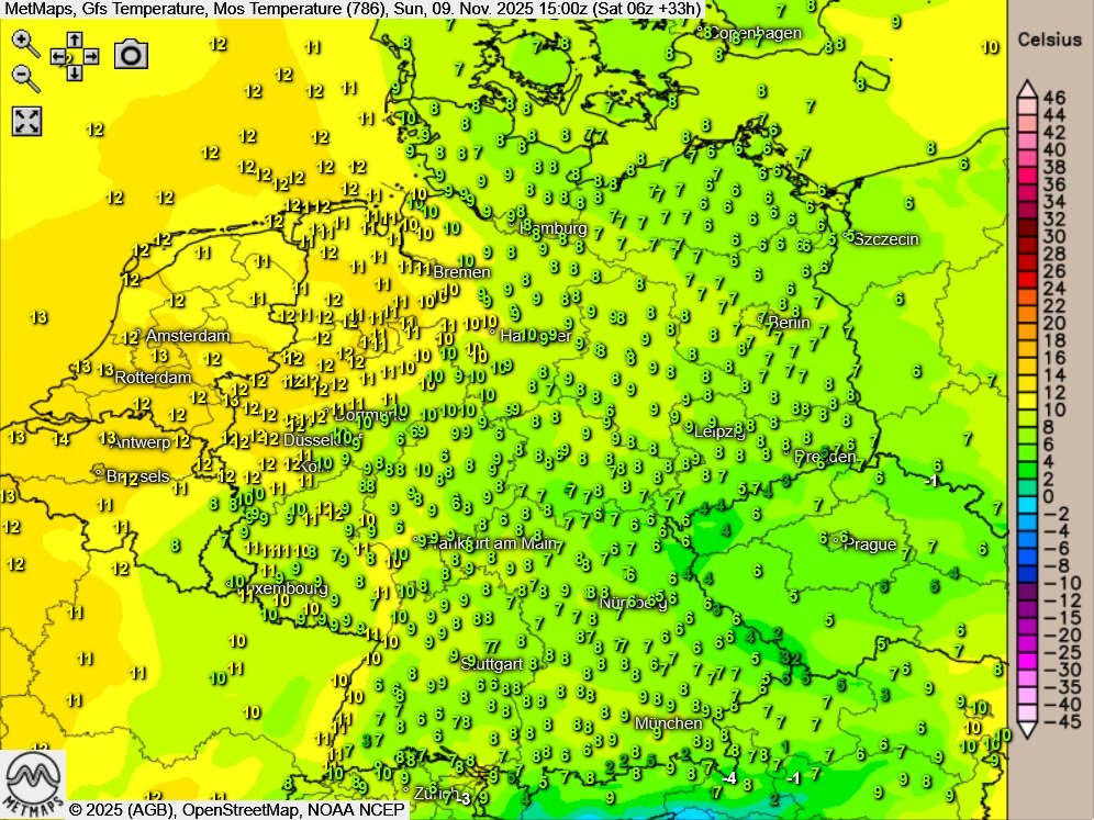 Am Sonntagnachmittag zeigt sich der Himmel verbreitet stark bewölkt oder es ist nebelig-trüb. Gebietsweise Auflockerungen beschränken sich vor allem auf die Hochlagen der Mittelgebirge sowie den äußersten Westen. Lokal kann am Nachmittag etwas Regen oder Sprühregen fallen.