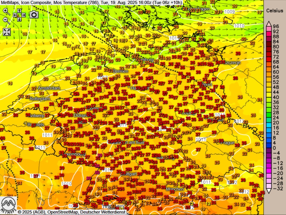 Die Strömungs- und Temperaturkarte für Dienstagnachmittag (16:00 Uhr) nach Icon: