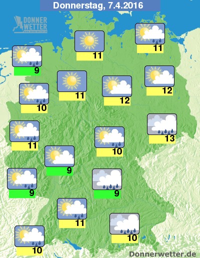 Am Donnerstag halten sich im Süden zumeist dichte Wolken, dazu fällt zeitweise Regen, in den anderen Landesteilen ist es zum Teil heiter bis sonnig, teilweise ziehen aber auch dichte Wolken durch, dabei sind einzelne Schauer möglich. Die Temperatur steigt auf 9 Grad in Mittelfranken und bis 13 Grad in der Lausitz.