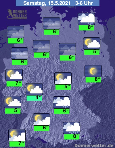 In der Nacht zum Samstag fällt im Nordosten des Landes unter dichten Wolken zunächst weiterhin gebietsweise Regen, der zum Morgen hin abklingt. Auch im Süden halten sich meist dichte Wolken und es fällt noch hier und da Regen. Im übrigen Land lockert und klart der Himmel verbreitet auf und es bleibt trocken. Die Temperatur sinkt auf 8 Grad in Neubrandenburg und bis 4 Grad im Raum Frankfurt.