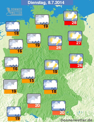 Dabei wird es im Süden und Westen mit nur 15 bis 20 Grad deutlich kühler als zuletzt. Nach Nordosten ist es bei schwülwarmen 24 bis 28 Grad deutlich wärmer.