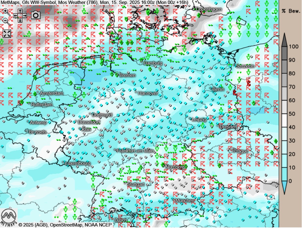 Am Montagnachmittag zeigt sich der Himmel über den meisten Landesteilen wechselnd bewölkt, dabei sind zeitweise Schauer möglich. Vor allem in Küstennähe sowie im Süden und Südosten muss neben kräftigen Schauern auch mit lokalen Gewittern gerechnet werden.