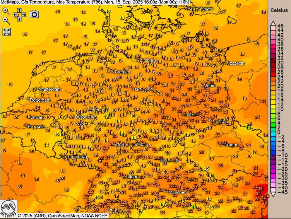 Die Wetter- und Temperaturkarte für Montagnachmittag (16:00 Uhr) sowie die Cape/Lifted-Karte (15:00 Uhr) nach GFS: