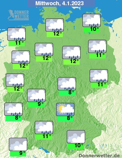 Am Mittwoch ziehen überwiegend dichte Wolken durch und Auflockerungen bleiben selten. Im Süden bleibt es zumeist trocken, während sonst zeitweise Regen fällt. Die Temperatur steigt auf 8 Grad in Erfurt und bis 12 Grad in Hannover. Es weht ein oft stürmischer Wind, an den See herrscht verbreitet Sturm.