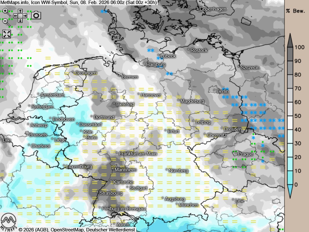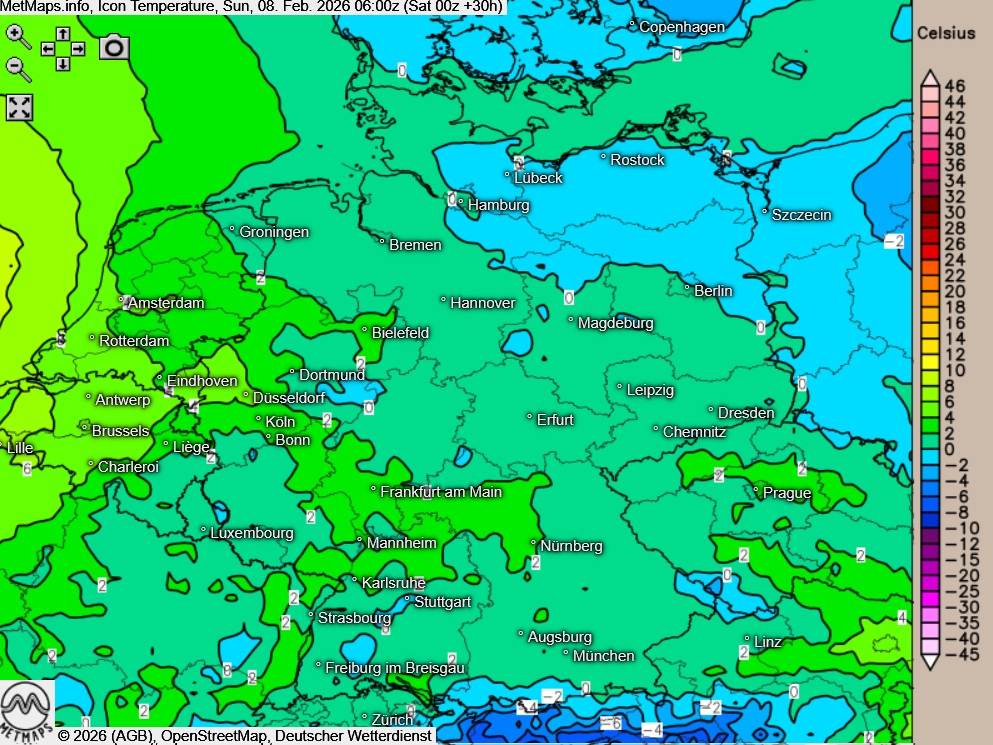 Die Temperaturen erreichen am Nachmittag Höchstwerte um 0 bis 4 Grad im Osten und Nordosten, die mildesten Temperaturen werden mit 10 Grad im Rheinland erreicht.