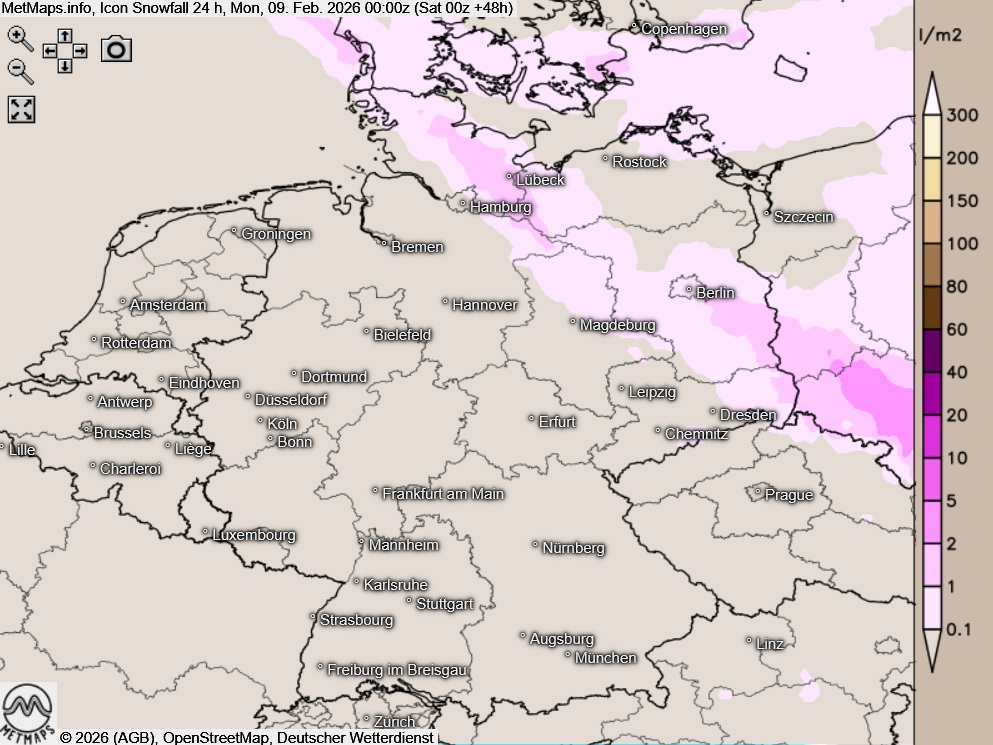 Die Wetter- und Temperaturkarte für Sonntagfrüh sowie die 24-Stunden-Schneemengen am Sonntag nach ICON: