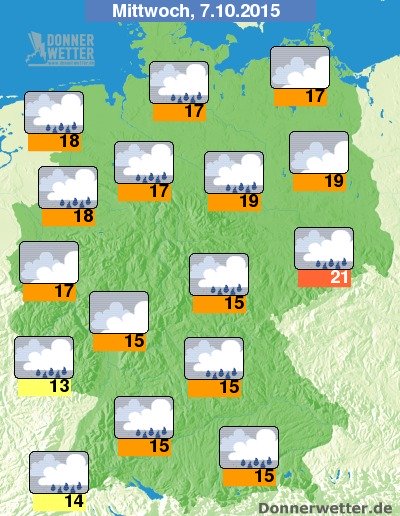 Heute bleibt der Himmel über der Bundesrepublik weitgehend bedeckt, dabei fällt vor allem in einem breiten Streifen von Bayern, über Thüringen, Niedersachsen bis nach Schleswig-Holstein hinein oft langanhaltender und auch kräftiger Regen. In den anderen Landesteilen bleibt es hingegen oft trocken oder es regnet nur gelegentlich. Auflockerungen sind hier aber dennoch eher selten. Die Temperatur steigt auf 13 Grad am Pfälzer Wald und bis 21 Grad in Dresden.