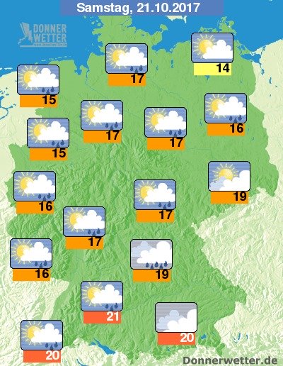 Am Samstag zieht ein Tiefausläufer vn West nach Ost über Deutschland hinweg, dazu fällt zeitweise Regen, abseits des Regens ist es aber auch oft locker bis aufgelockert bewölkt. Die Temperatur erreicht 14 Grad in Rostock und etwa 21 Grad in Stuttgart.