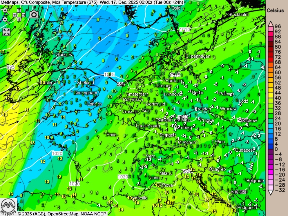 Die Strömungs- / Temperaturkarte für Mittwochfrüh (06:00 Uhr) sowie die 24-Stunden-Regenmengen für Europa nach GFS:
