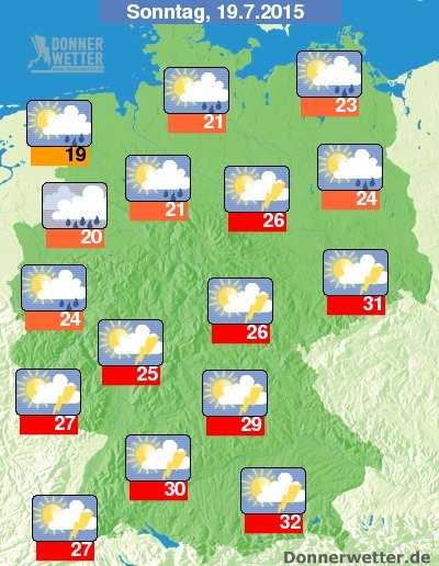 Am Sonntag zeigt sich hier und da die Sonne, häufig ziehen aber auch kompakte Wolken durch und insbesondere nachmittags entwickeln sich zeitweise Schauer und teils kräftige Gewitter. Im äußeren Nordwesten fällt zeitweise Regen. Die Temperatur steigt auf 19 Grad an der Nordsee und bis auf schwülheiße 32 Grad in München.