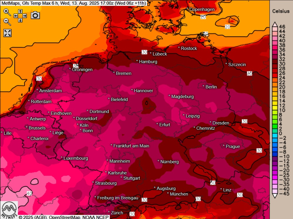 Die Temperaturen erreichen Höchstwerte um 31 Grad in Berlin und um 37 Grad im Rhein-Main-Gebiet. Auf Rügen Höchttemperaturen um 28 Grad.
