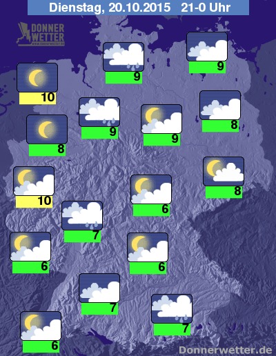 Heute Abend ist es verbreitet stark oder dicht bewölkt, hier und da lockert die Bewölkung aber auch auf, es fällt gebietsweise Regen. Von Nordwesten her klart der Himmel immer weiter auf und nachfolgend bleibt es hier auch trocken. Die Abendtemperatur liegt bei 10 Grad in Köln und 6 Grad in Oberfranken.