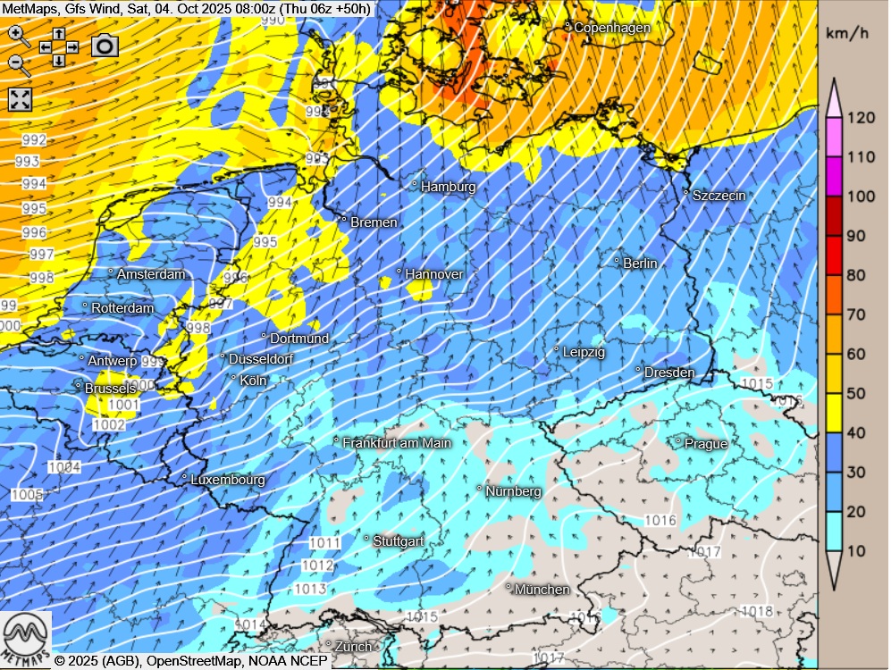 Die Wetter- / Temperaturkarte für 06:00 Uhr, die Böenkarte für 08:00 Uhr und die 24-Stunden-Regenmengen am Samstag nach GFS: