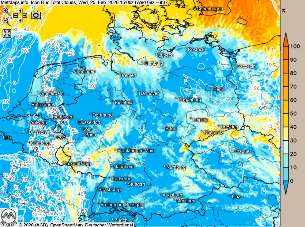 Die Temperatur- und Bewölkungskarte (totale Bewölkung) für Mittwochnachmittag (15:00 Uhr) nach ICON-RUC: