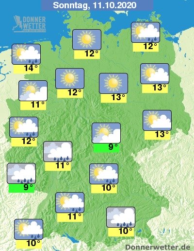 Am Sonntag ist es häufig heiter bis sonnig, vor allem im Süden ziehen aber auch verbreitet dichte Wolken durch, dabei bilden sich lokale Schauer. Im übrigen Land ist es hier und da auch mal stärker bewölkt, Schauer entwickeln sich allerdings nur selten. Die Temperatur erreicht 9 Grad am Pfälzer Wald und bis 14 Grad in Emden.