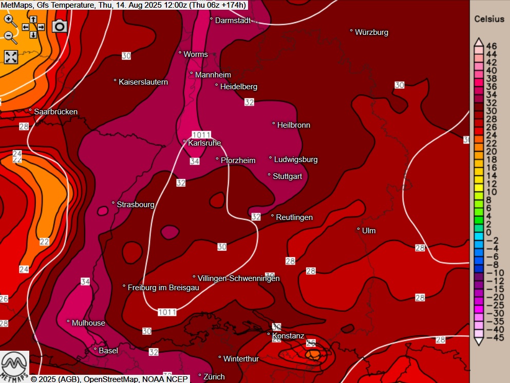 Die Karten zeigen die deutschlandweiten Sechs-Stunden-Maximaltemperaturen für den kommenden Samstag (12.00 bis 18.00 Uhr) nach ICON sowie die aktuell vom US-Modell berechneten Lufttemperaturen im Südwesten am 14.08.