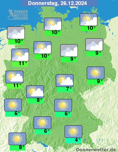 Am heutigen 2. Weihnachtsfeiertag zeigt sich das Wetter im Süden verbreitet heiter bis sonnig, nördlich des Mains bleibt es hingegen zumeist trüb oder stark bewölkt, aber es kann auch etwas auflockern. Es bleibt trocken bei Höchstwerten von 4 Grad in Augsburg und bis 11 Grad in Emden.