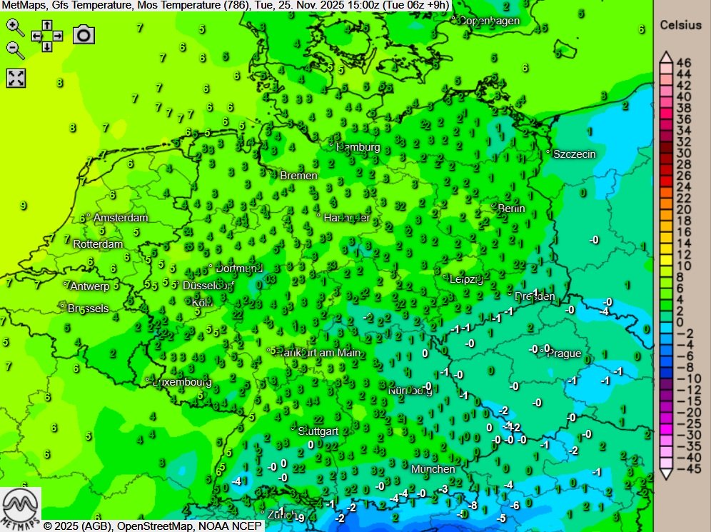 Die Wetter- und Temperaturkarte (15:00 Uhr) sowie die Sechs-Stunden-Regenmengen bis 23:00 Uhr nach GFS: