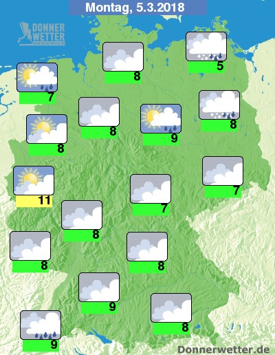 Heute zeigt sich das Wetter zum Großteil stark bewölkt oder trüb, der anfängliche Regen oder Schneeregen über dem Nordosten Deutschlands zieht zum Nachmittag hin ab, währenddessen zieht im Südwesten im Tagesverlauf neuer Regen auf, sonst bleibt es jedoch verbreitet trocken. Die Temperatur steigt auf 5 Grad in Rostock und bis 11 Grad in Köln.