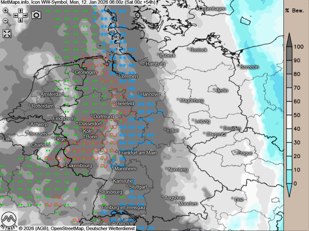 Bereits in der kommenden Nacht setzt von der Nordsseküste bis in den Schwarzwald Schneefall ein, teils fällt auch gefrierender Regen, wodurch verbreitet eine erhebliche Glatteisgefahr entsteht.