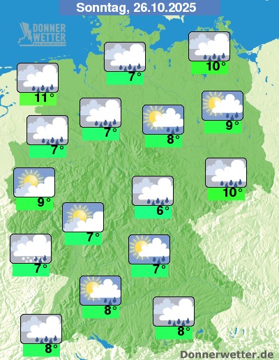 Am Sonntag zieht zumeist starke, teilweise auch aufgelockerte Bewölkung durch. Es fällt immer wieder, zum Teil kräftiger Regen. Die Temperatur steigt auf 6 Grad im Grabfeld und bis 11 Grad direkt an der Nordsee. Vor allem im Norden, später auch im Osten herrscht zum Teil Sturm mit möglichen schweren Sturmböen. Auch sonst weht der Wind oft stark bis stürmisch.