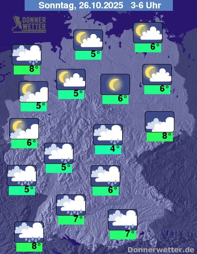 In der Nacht zum Sonntag lockert und klart der Himmel über der Nordhälfte verbreitet auf. Über der Südhälfte bleibt es meist bedeckt und hier fällt auch häufig Regen oder es bilden sich Schauer, sonst bleibt es meist trocken. Der Wind nimmt noch etwas zu und weht im Norden stark bis stürmisch, an der Nordsee mit Sturmböen. Weiter nach Süden hin weht der Wind oft stark. Die Temperatur sinkt auf 8 Grad am Oberrhein und bis 4 Grad im Vogtland.