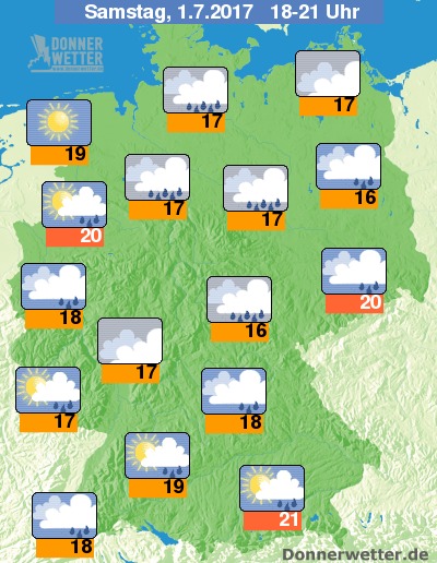 Heute Nachmittag bleibt es im Norden und Westen meist regnerisch. Weiter nach Südosten hin ist es zwar ebenfalls meist bedeckt, jedoch bilden sich hier eher einzelne Schauer. Am freundlichsten zeigt sich das Alpenvorland, hier ist es heiter oder wechselnd bewölkt und weitgehend trocken. Die emperatur liegt bei kühlen 15 Grad an der Weser und bis 21 Grad in München.