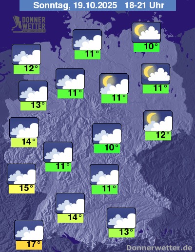 Heute Abend ist es im Nordosten noch oft locker oder wechselnd bewölkt. Im übrigen Bundesgebiet ist der Himmel weitgehend dicht bewölkt, allerdings bleibt es trocken. Die Temperatur liegt bei 10 Grad am Thüringer Wald und 17 Grad am Oberrhein.