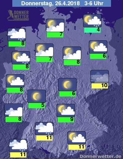 In der Nacht zum Donnerstag zeigt sich der Himmel oft nur locker bewölkt oder sternenklar, im Südwesten und Norden ziehen vorübergehend dichte Wolken durch, die einzelne Schauer bringen können, sonst bleibt es aber weitgehend trocken. Die Temperatur sinkt auf 11 Grad im Breisgau und etwa 4 Grad an der Müritz.