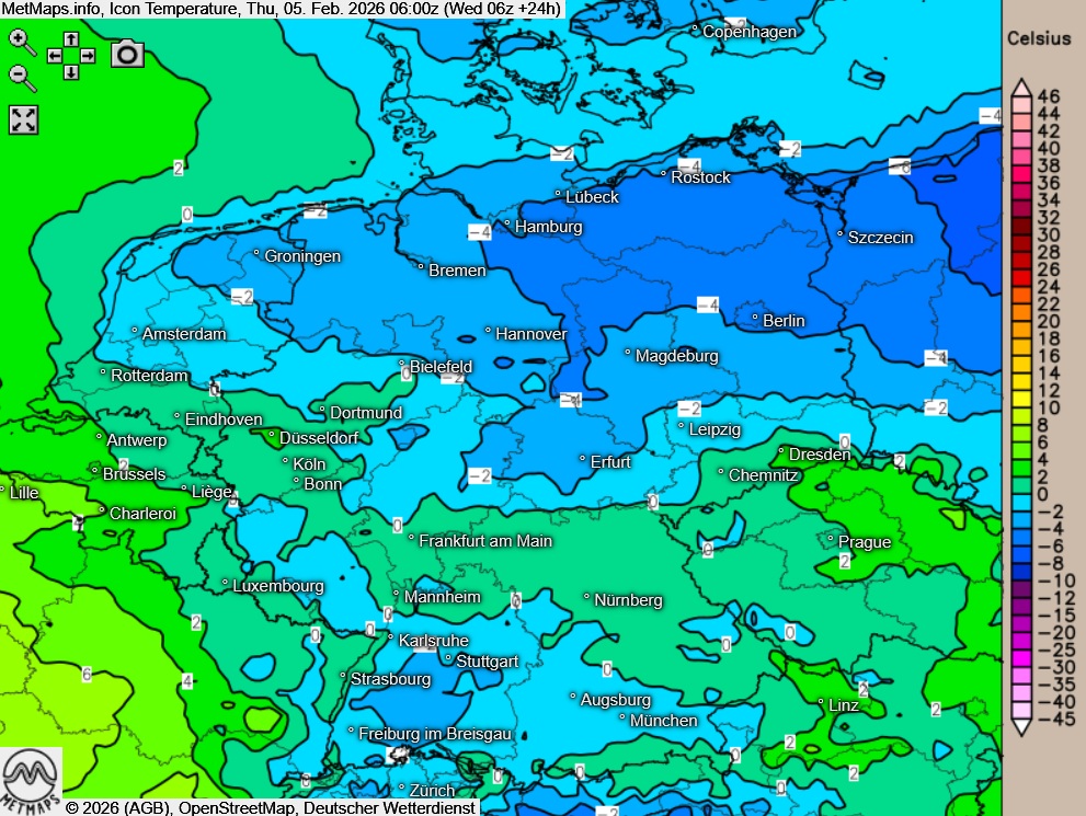Die Temperatur- und Wetterkarte für Donnerstagfrüh (06:00 Uhr) sowie die 24-Stunden-Schneemengen für Donnerstag nach ICON: