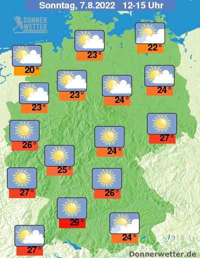 Heute Nachmittag ist es im Norden und am Alpenrand teils wechselnd bis stark bewölkt, im übrigen Land zeigt sich das Wetter hingegen verbreitet heiter bis sonnig. Es bleibt landesweit trocken bei etwa 20 Grad im nördlichen Emsland und bis 29 Grad in Schwaben.