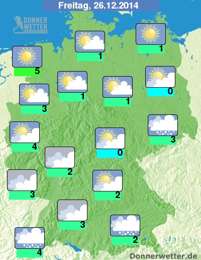 Heute gibt es besonders in der Südhälfte des Landes einige Schneefälle, die sich jedoch am Nachmittag mehr und mehr auf den Süden Deutschlands, und hierbei insbesondere aufs Alpenvorland beschränken, dafür fällt hier auch teils langanhaltend Schnee. Vor allem im Norden, aber auch vielerorts in der breiten Mitte der Republik zeigt sich der Tag nicht selten freundlich mit zum Teil sogar sonnigem Wetter, dazu bleibt es hier weitgehend trocken. Die Temperatur steigt auf 0 Grad in Neubrandenburg und bis 5 Grad an der Nordsee.