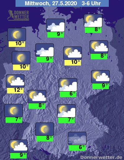 Bis zu den Frühstunden kühlt die Luft auf 12 bis 6 Grad ab, am mildesten bleibt es von der Ems bis ins Ruhrgebiet, am kühlsten wird es in Bayern.