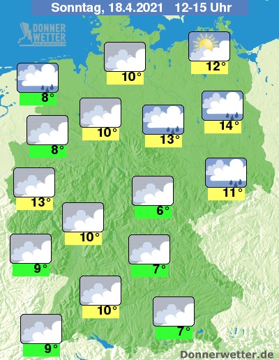 Heute Nachmittag zeigt sich das Wetter überwiegend stark, nur hier und da auch mal etwas aufgelockert bewölkt. Über dem Osten und Norden bilden sich zeitweise, im übrigen Land nur vereinzelt Schauer. Im Osten sind sogar vereinzelt auch Gewitter möglich. Die Temperatur steigt auf nasskalte 6 Grad im Eichsfeld und bis 14 Grad in Berlin.