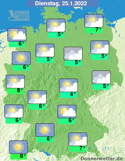 Am Dienstag halten sich über der Nordosthälfte meist dichte Wolken, im übrigen Land ist es teils dicht bewölkt, oft zeigen sich aber auch Auflockerungen. Es bleibt landesweit trocken bei 4 Grad in Erfurt und bis 9 Grad in Freiburg.