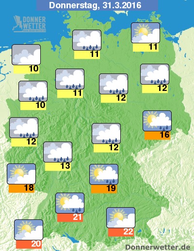 Am Donnerstag ist es im Süden überwiegend aufgelockert bis stark bewölkt und dazu trocken, über der breiten Mitte Deutschlands halten sich jedoch dichte Wolken und es fällt zeitweise Regen, im Norden zeigt sich der Himmel zwar stark bewölkt, jedoch bleibt es hier zumeist trocken. Die Temperatur steigt auf 10 Grad in Ostfriesland und bis 22 Grad in Augsburg.