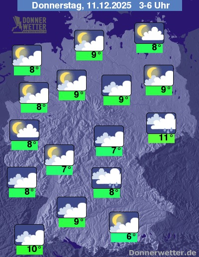 In der Nacht zum Donnerstag zieht der Regen nach Südosten hin ab und auch über der Südosthälfte klingt der Regen bis zum Morgen nach und nach ab. Über der Nordwesthälfte ist es oft stark, gebietsweise aber auch aufgelockert bewölkt, dazu bleibt es trocken. Die Temperatur sinkt auf 11 Grad in Dresden und bis etwa 6 Grad in Augsburg.