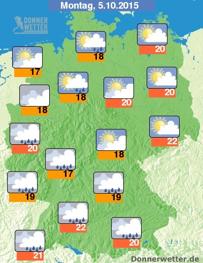Am Montag ist es über dem Norden und Osten der Republik häufig heiter oder sonnig und es ziehen nur hier und da auch dichte Wolken mit etwas Regen durch. Über der Südwesthälfte Deutschlands ist es dagegen oft stark, vor allem am Vormittag aber auch oft aufgelockert bewölkt und zunächst weitgehend trocken. Gegen Nachmittag und Abend zieht aus Südwesten her jedoch, teils langanhaltender Regen auf. Die Temperatur steigt auf 17 Grad an der Nordsee und bis auf spätsommerlich warme 22 Grad in Dresden.
