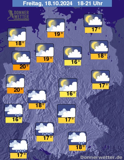 Heute Abend fällt über dem Südwesten des Landes verbreitet Regen, auch in der übrigen Südhälfte bleibt es meist stark bewölkt, dazu jedoch weitgehend trocken. Über der Nordhälfte ist es oft wechselnd bis aufgelockert, teils auch stark bewölkt und dazu trocken. Die Temperatur liegt bei 16 Grad in Jena und sehr milden 20 Grad in Köln.