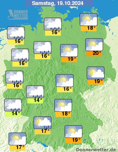 Am Samstag scheint im Osten und Nordosten noch oft die Sonne, sonst ist es überwiegend aufgelockert oder stark bewölkt. Im Westen und Nordwesten fällt gebietsweise Regen, in den übrigen Landesteilen bleibt es hingegen meist trocken. Die Temperatur steigt auf 14 Grad im Saargau und bis 20 Grad in Berlin.