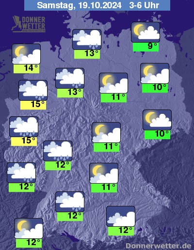 In der Nacht zum Samstag erstreckt sich das Regengebiet vom Südwesten her auch über den Westen und bis zum Morgen auch in den Nordwesten und Norden Deutschlands. Im Südwesten klingt der Regen zum Morgen hin langsam ab. In den übrigen Landesteilen ist es meist stark, teils aufgelockert bewölkt und dazu trocken. Die Temperatur sinkt auf 15 Grad am Niederrhein und bis 9 Grad in Vorpommern.