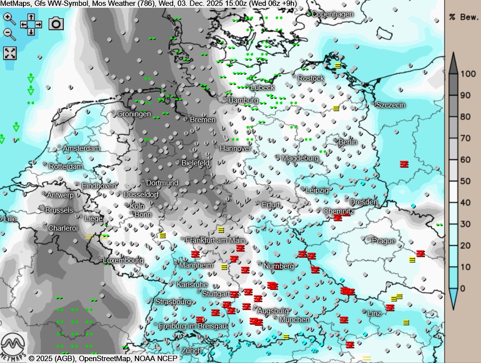 Am Mittwochnachmittag zeigt sich der Himmel über dem Norden und Westen stark bewölkt, dabei fällt zeitweise etwas Regen. In den übrigen Landesteilen hält sich weiterhin teils zäher Hochnebel, größere Auflockerungen sind am ehesten in der Osthälfte sowie im Alpenumland möglich, dabei bleibt es trocken.