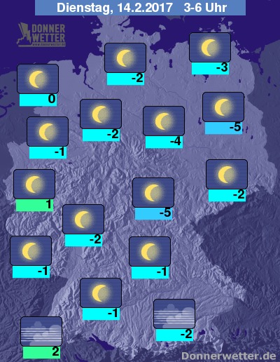 In der Nacht zum Dienstag ist es nur im Alpenvorland häufig neblig-trüb oder auch stark bewölkt, sonst zeigt sich ein sternenklarer Nachthimmel. Es bleibt überall trocken bei Tiefstwerten von 2 Grad im Oberrheingraben und um -5 Grad in der Uckermark.