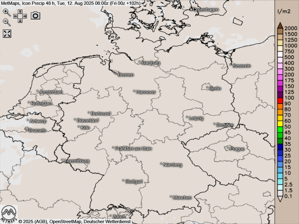 Die Wetter- und Temperaturkarte für Samstagfrüh (06:00) Uhr sowie die akkumulierten 48-Stunden-Regenmengen bis Dienstagfrüh nach ICON.
