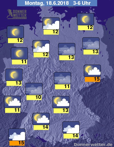 In der Nacht zum Montag sind am Alpenrand zunächst weitere Schauer und auch Gewitter möglich, sonst lockert und klart der Himmel aber verbreitet auf und es bleibt auch trocken. Die Temperatur sinkt auf 15 Grad in Freiburg und bis 10 Grad am Taunus.