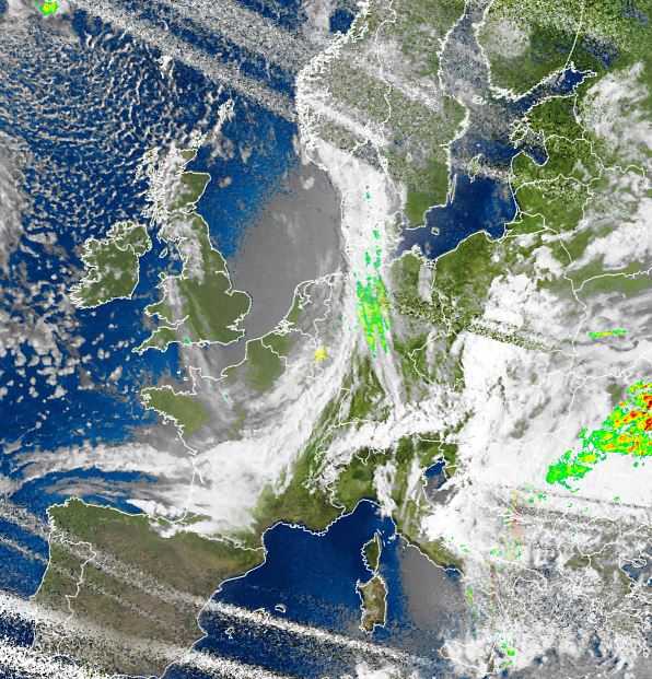 Das Satellitenfoto von heute Morgen zeigt die Front des Islandtiefs "Waltraud". Sie erstreckte sich von der Biskaya, über Frankreich, dem Saarland, weiter über die Osthälfte Niedersachsens, Schleswig-Holstein bis über Dänemark in die Nordsee. Entlang dieser sog. Okklusion fiel zeitweise Regen, der jedoch meist nicht lange andauerte.