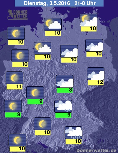 In der Nacht zum Mittwoch halten sich über dem Südosten und dem äußeren Osten des Landes noch überwiegend dichte Wolken, die auch zeitweise Regen bringen können. Über dem übrigen Osten und Nordosten ist es teils stark, teils aufgelockert bewölkt, jedoch trocken. Weiter nach Westen hin zeigt sich der Himmel weitestgehend sternenklar, hier und da sind ein paar Wolken möglich, dabei bleibt es trocken. Die Temperatur sinkt auf 6 Grad an der Oder und auf etwa 1 Grad am Taunus.