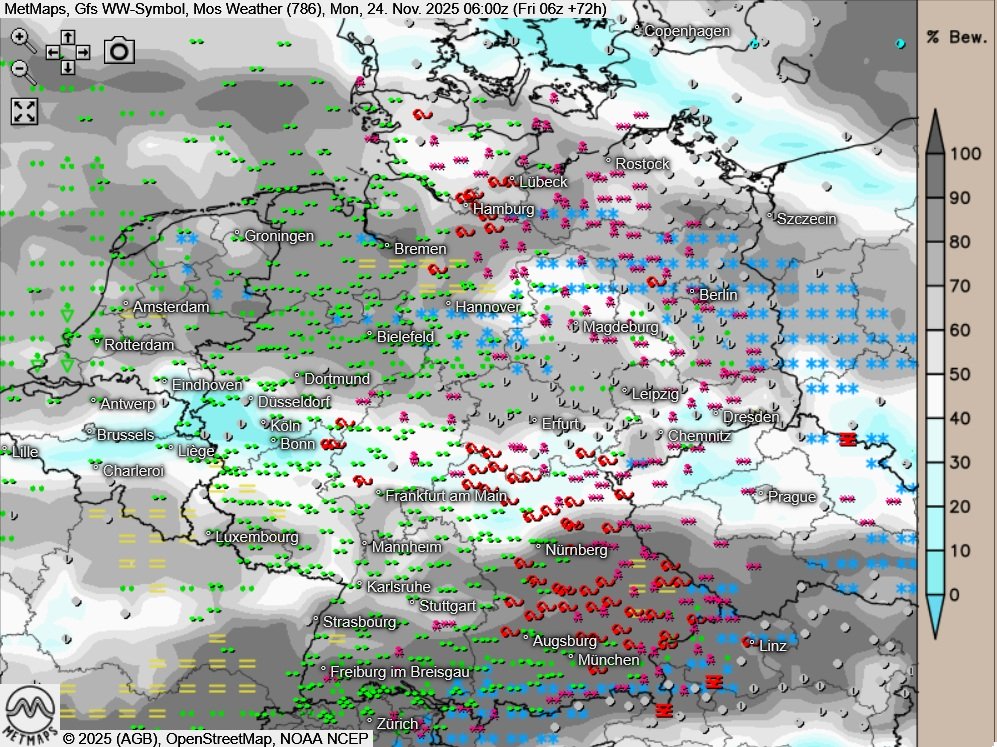 Die Temperatur- und Wetterkarte für Montagfrüh (06:00 Uhr) nach GFS: