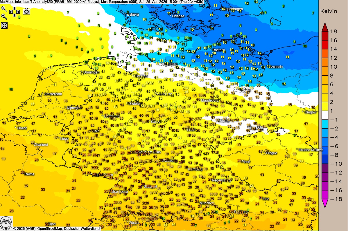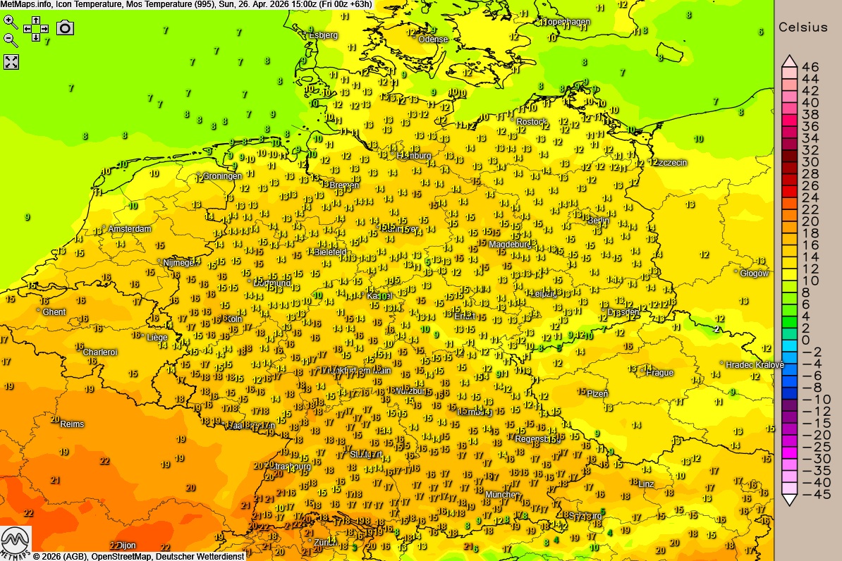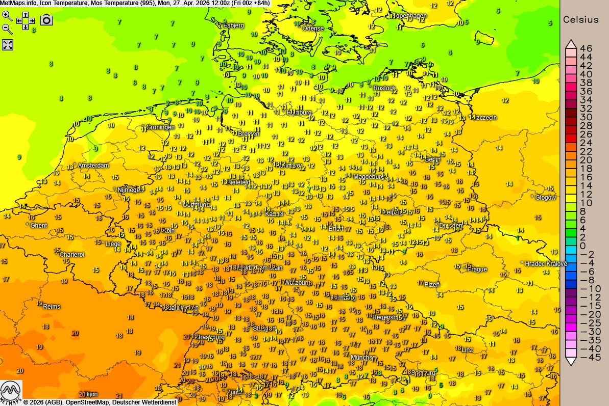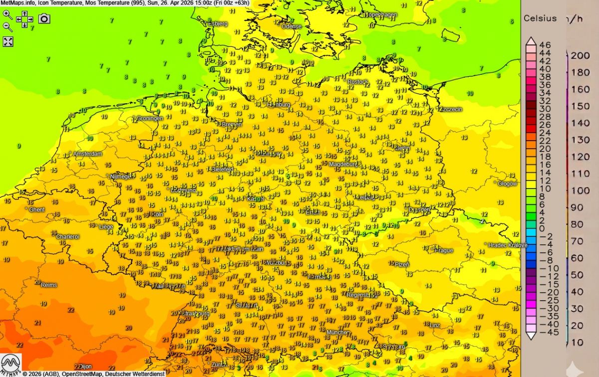 Die Höchstwerte erreichen am Oberrhein bis zu 23 Grad, während es im Norden bei 12 bis 16 Grad bleibt.